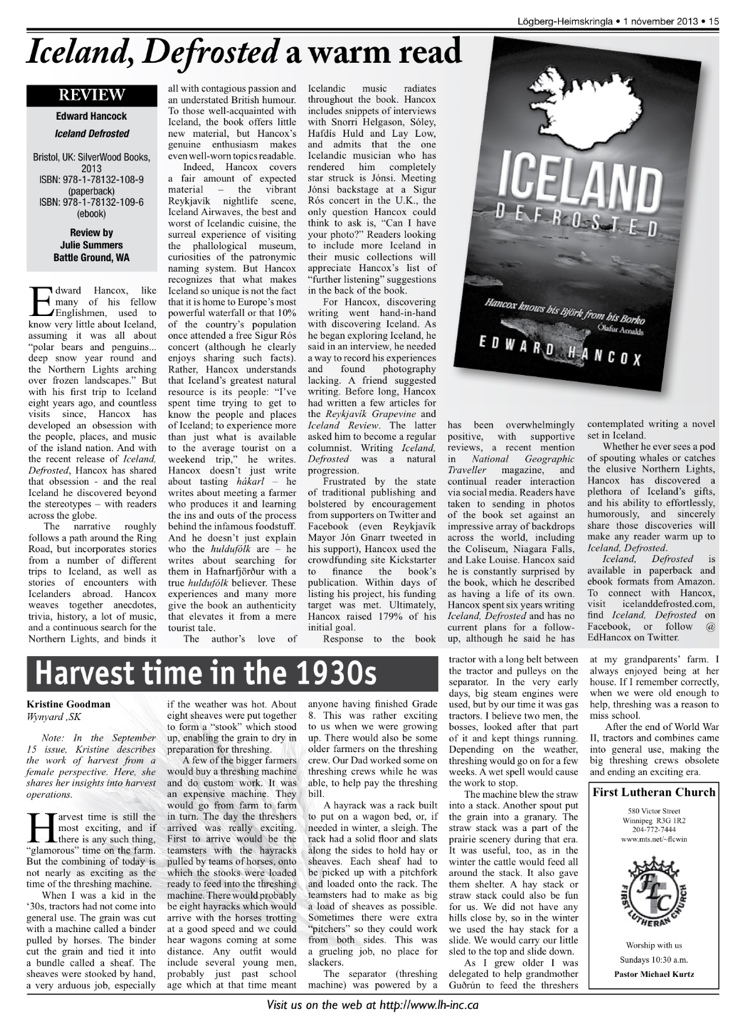 Iceland, Defrosted has received a wonderful, glowing review from Lögberg-Heimskringla, the Canadian-Icelandic publication. A huge thanks to Julie Summers for her kind words.