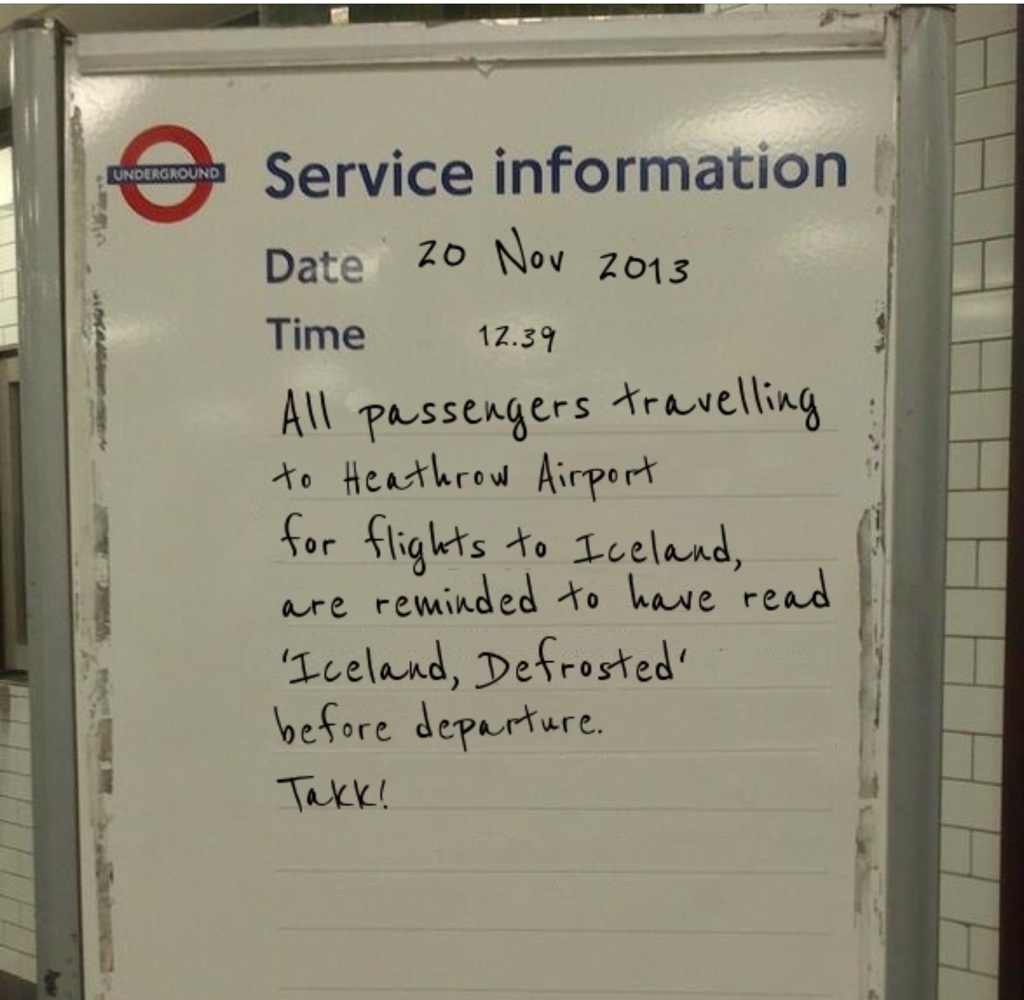 Iceland, Defrosted announcement on London Underground! November 20, 2013 · by icelanddefrosted Share this: Click to share on X (Opens in new window) X Click to share on Facebook (Opens in new window) Facebook Like Loading... Related